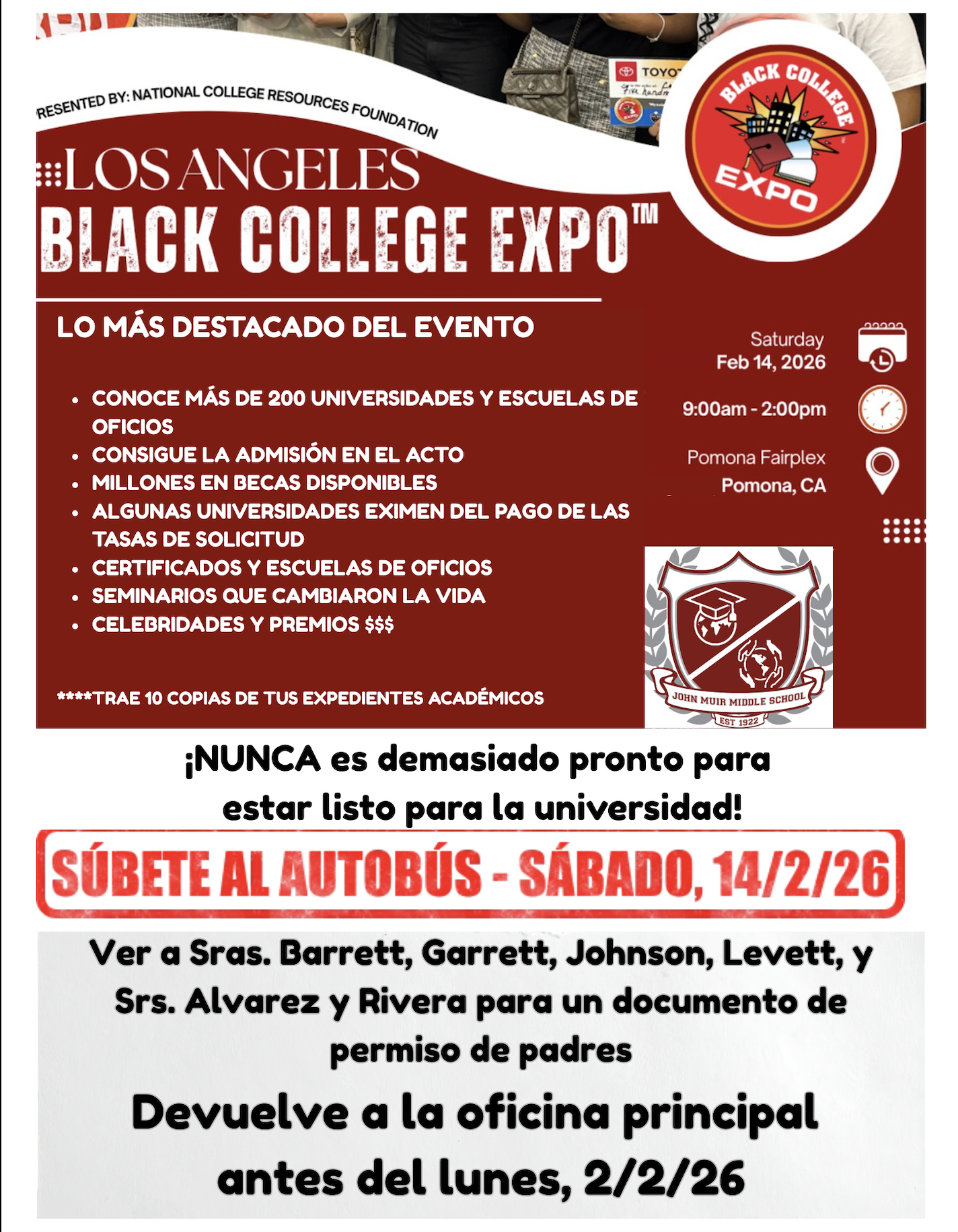 Excursión a la Black College Expo: sábado 14 de febrero de 2026. Ver el volante para obtener información sobre dónde obtener su documento de permiso por parte de padre y más detalles.