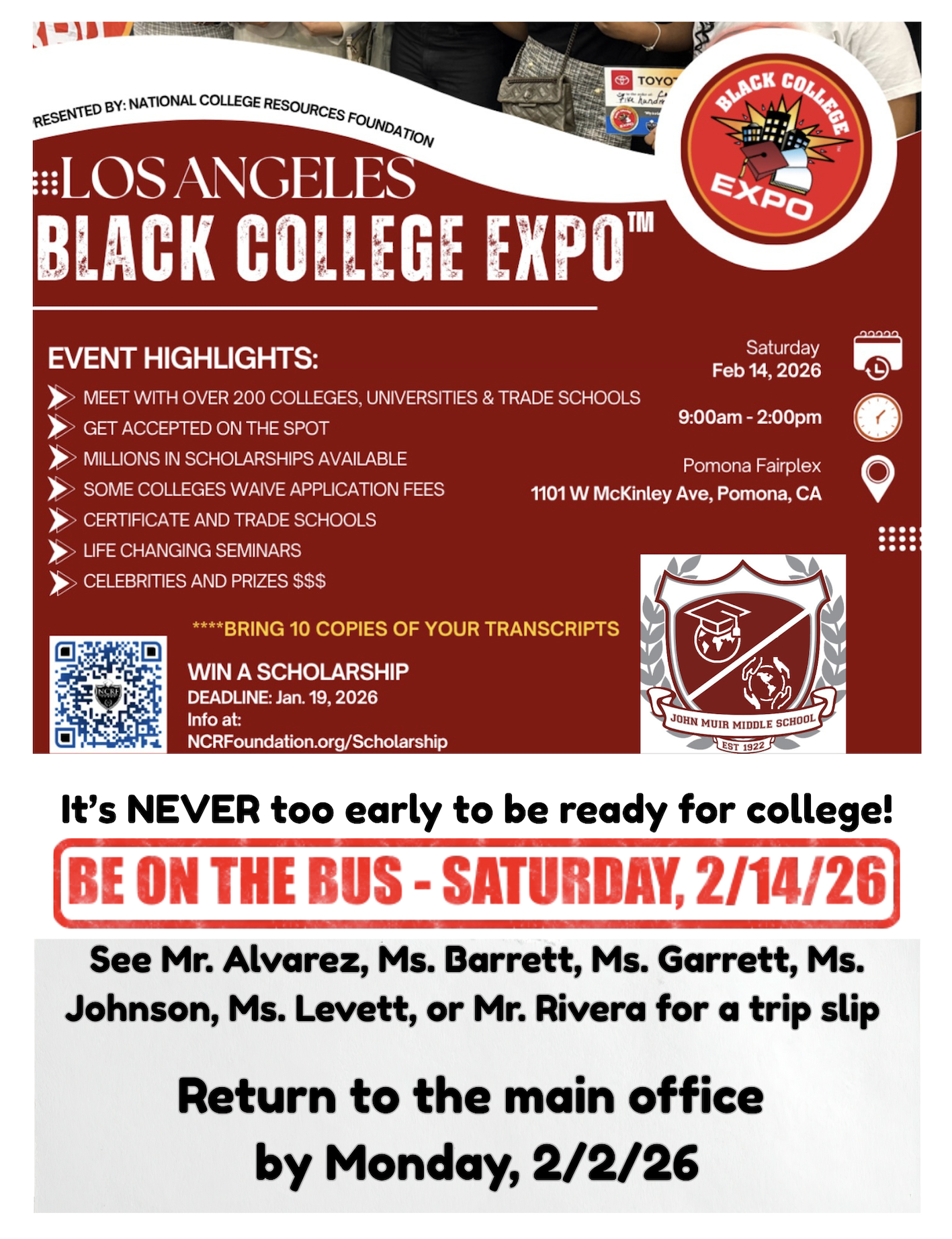 Black College Expo field trip: Saturday, February 14, 2026. See flyer for where to get your trip slip and more details.